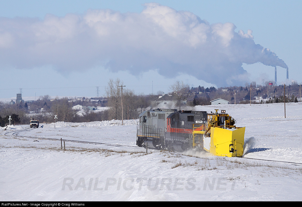The Jordan Spreader is about to pass under highway 83 a few miles south of Washburn. The section crew is patrolling behind the train looking over the track since this crew is flagging and widening the snow drifts. Smoke from the Coal Creek Power Plant near Falkirk is blowing south today in the background.