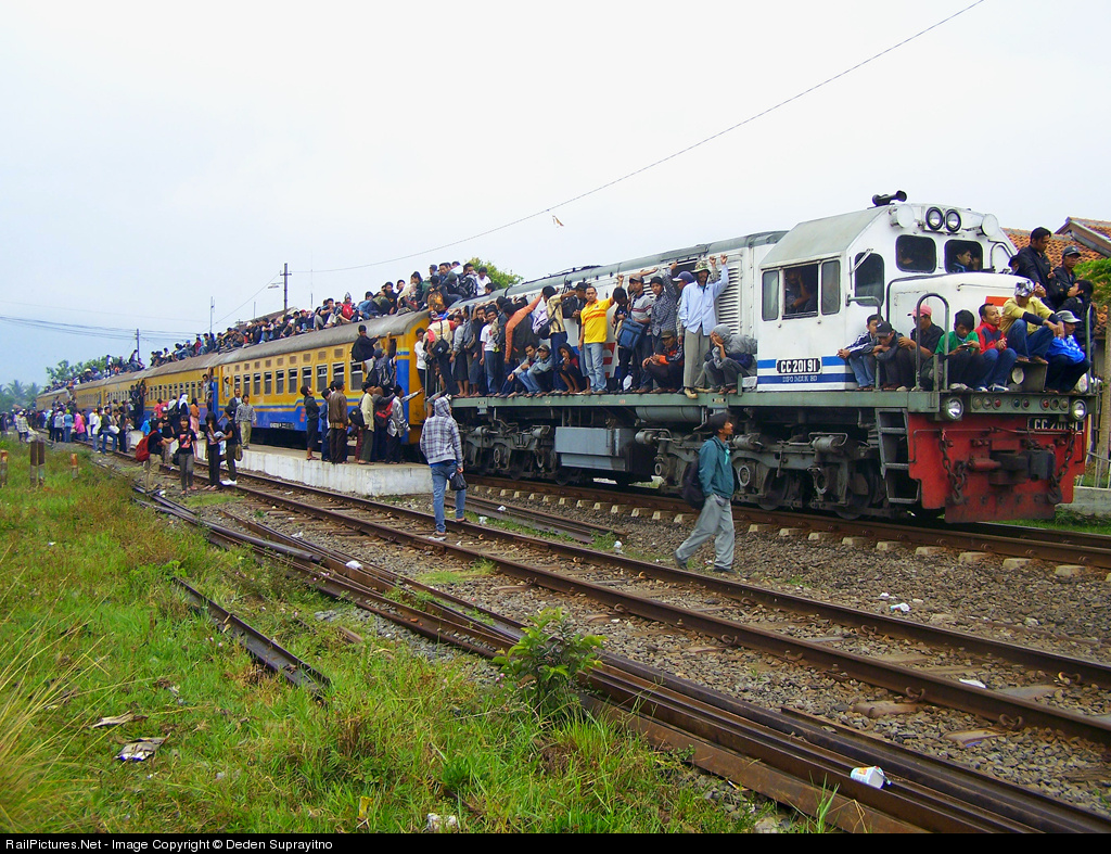 | Morning at Leles when local commuter (we call this trainset is Mandra, or Jimm West Tarin) arrived, this time it's holyday. the passenger not woried about they safety. this trainset served Cibatu - Purwakarta VV |