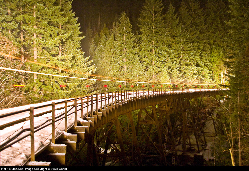 Thanks again to the ATCS monitor system, a group of us were prepared for a westbound out of the Cascade tunnel. It was dark, I mean really dark. Huddled on the side of a snow hill, I had plenty of time to try longer and longer exposures. By the time the train was heard coming down the hill, 10 minutes was going to be the minimum. 16 minutes was required to make this image, which includes both ends of the train. Did I mention it was dark, and cold! Click Here for another winter view of this bridge.