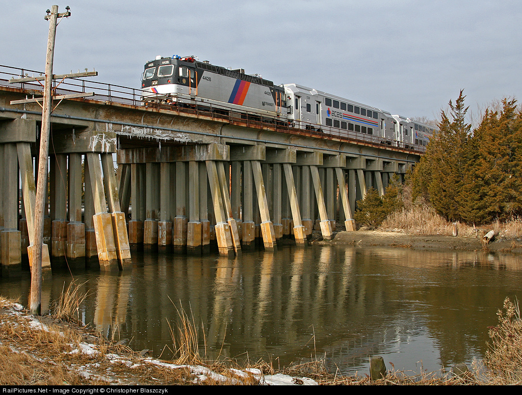 | Coming up ACES. NJT ALP44 4428 brings up the rear of the late morning northbound ACES out of Atlantic City, seen here only a few miles into the run as they fly over Absecon Creek. |
