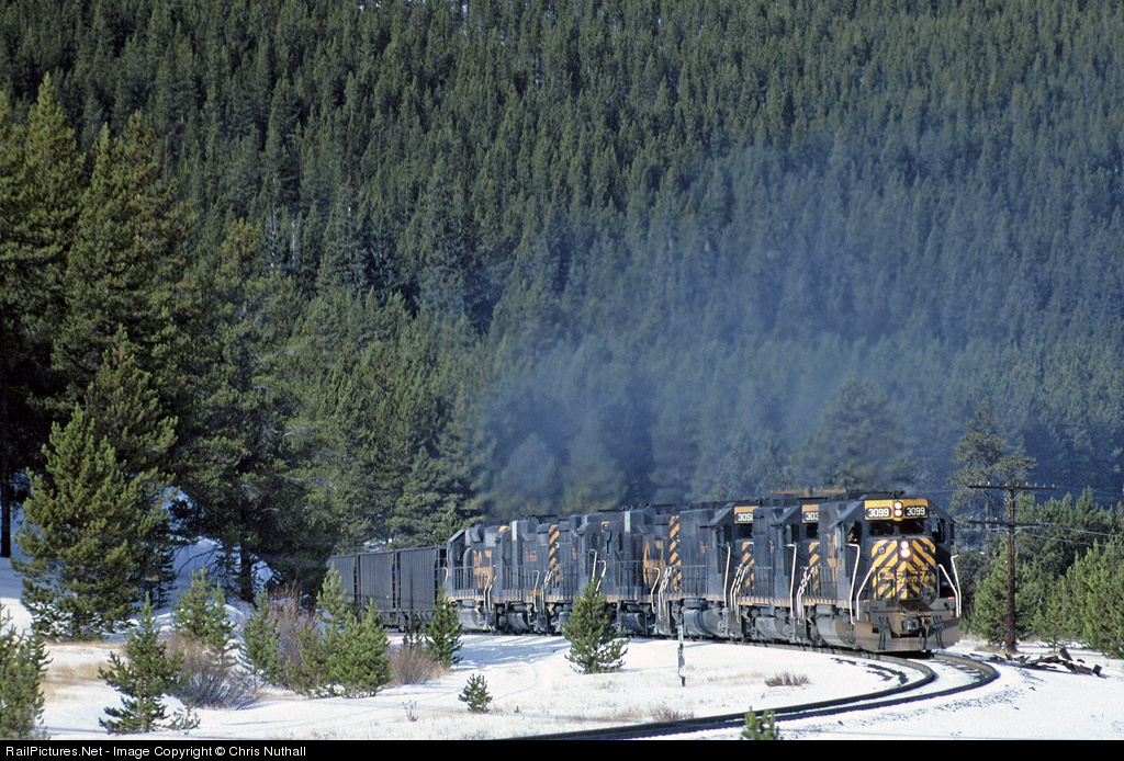 Another shot of the head end of a twenty locomotive 100-car #790 eastbound coal from November 1981, this time approaching the last curve before the tunnel under Tennessee Pass, behind 3099 3033 3056 3014 3026 3020 3111. Mid-train helpers are 3116 3057 3054 3048 3043 3080 3029 3044 3031 3096 with 5396 5333 5322 in the swing. The sound, with every locomotive in eighth notch, was unbelievable!