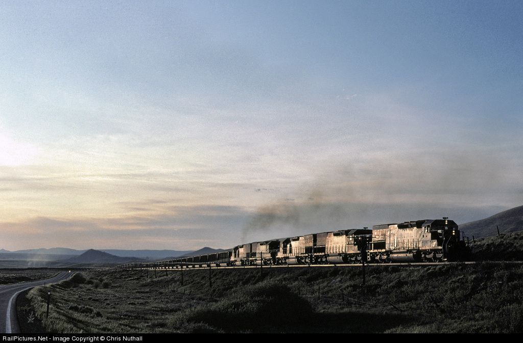 | Catching the last rays of the day, 5362 5358 5395 5344 5345 and helpers 5354 5390 5410 5401 haul #707 coal from Phippsburg approaches Toponas in June 1981. The train stopped at Toponas for a meet and the crew offered to give me a once in a lifetime ride into Denver. Unfortunately leaving my car in the middle of nowhere overnight and the chance of getting back the next morning led me to decline the offer! |
