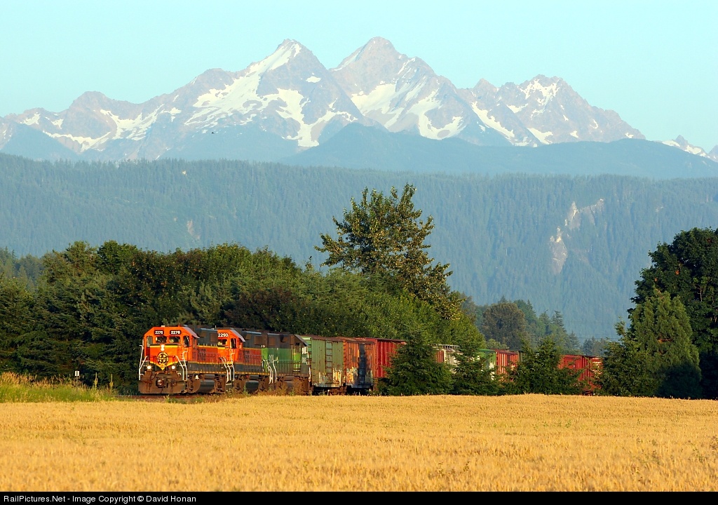 | Washington's Cascade Mountains are well-known in the railfan community for both acting as a picturesque backgrounds for flatland locations (everybody loves Mt. Rainier) and the numerous scenic highlights of its three mountain passes. This is a lesser-known example of the former application: The "644," BNSF's Everett-to-Sumas local, works northward out of a tree tunnel on the Sumas Sub with Twin Sisters Mountain dominating the skyline and soaking up the last rays of light on a glorious summer afternoon. A lone bird in the distance imitates this photographer by shadowing the train's northward trek. |