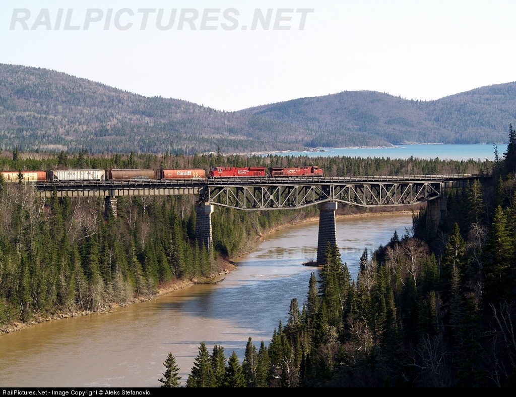 CP 301, an empty grain train is crossing the Little Pic River bridge on its way towards Thunder Bay. Power is CP 9534 - CP 8853.
