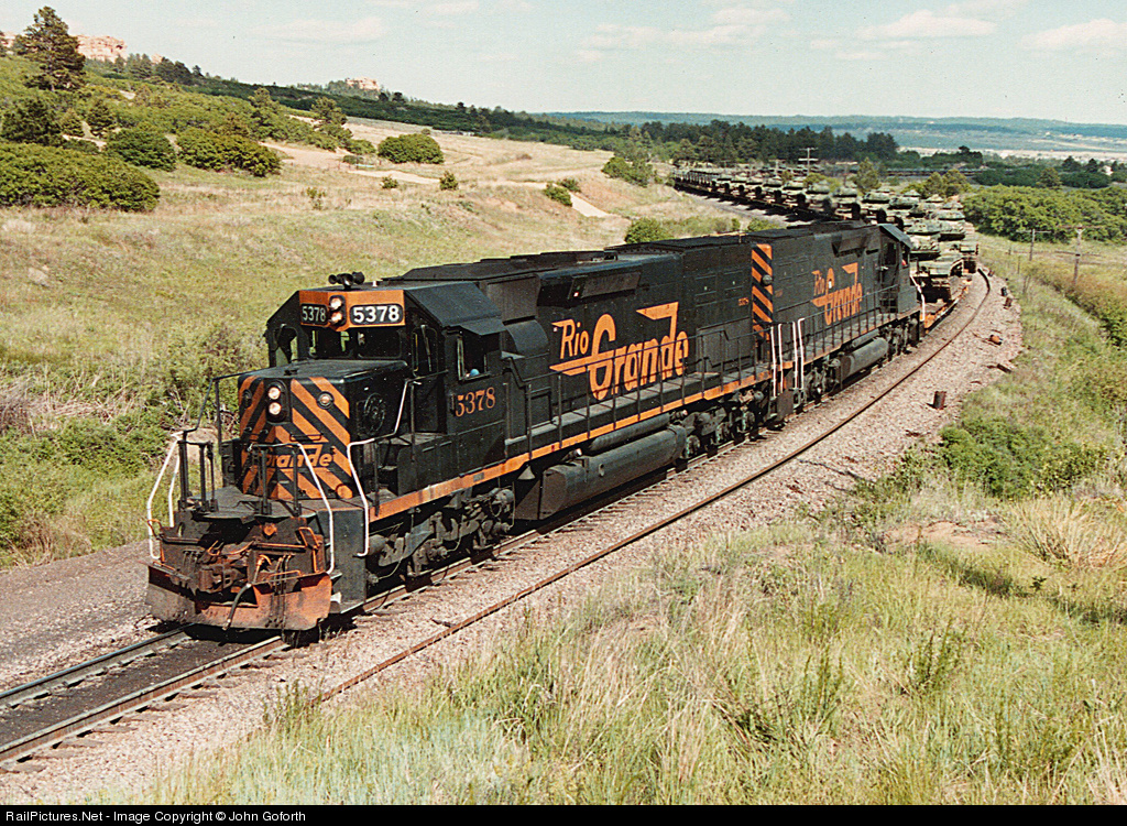 | Train load of M60 tanks from Ft Carson, headed to Ft Irwin, CA for training exercise, with DRGW 5378 on the point. |
