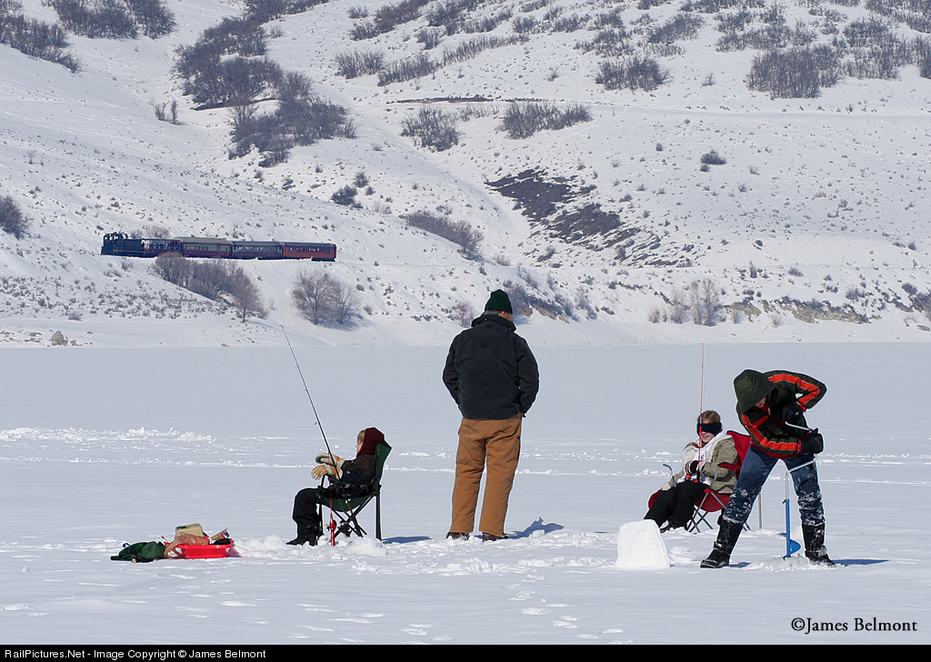On a frigid winter morning, a father enjoys the company of his two sons and daughter, each hoping for a bite below the icy surface of Utah's Deer Creek Reservoir. The older son is busy drilling through the ice, hoping to catch the first fish of the day. Meanwhile, on the western shore of the lake, Heber Valley Railroad's 'Lakeside Limited' rambles along the shoreline, headed south toward the passing siding at Wallsburg.