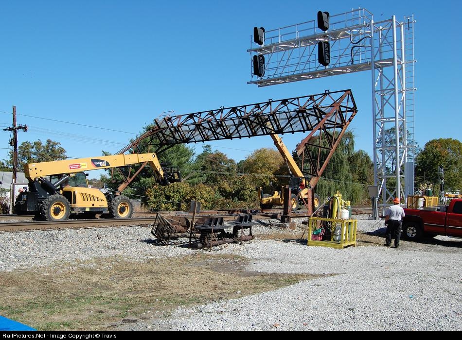 Cranemaster employees remove the west facing C&O signal bridge in Hurricane. You can see some of the signal heads on the ground.