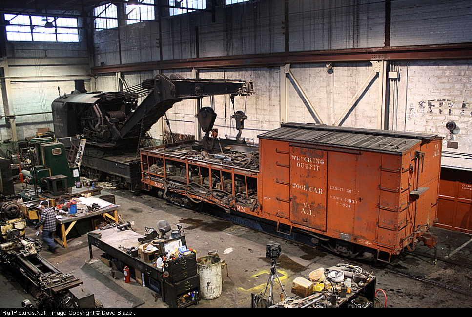 | Can you find what's out of place? There is something in this photo giving away the fact that it's not a half century earlier. Regardless, this few looks down from the stairs that lead to the overhead crane. The two bay machine shop is an annex on the south side of the large engine house building. Coal fired steam crane "A" was built in 1907 and its attendant tool car home built in 1939 from half a boxcar and half a flat car. |