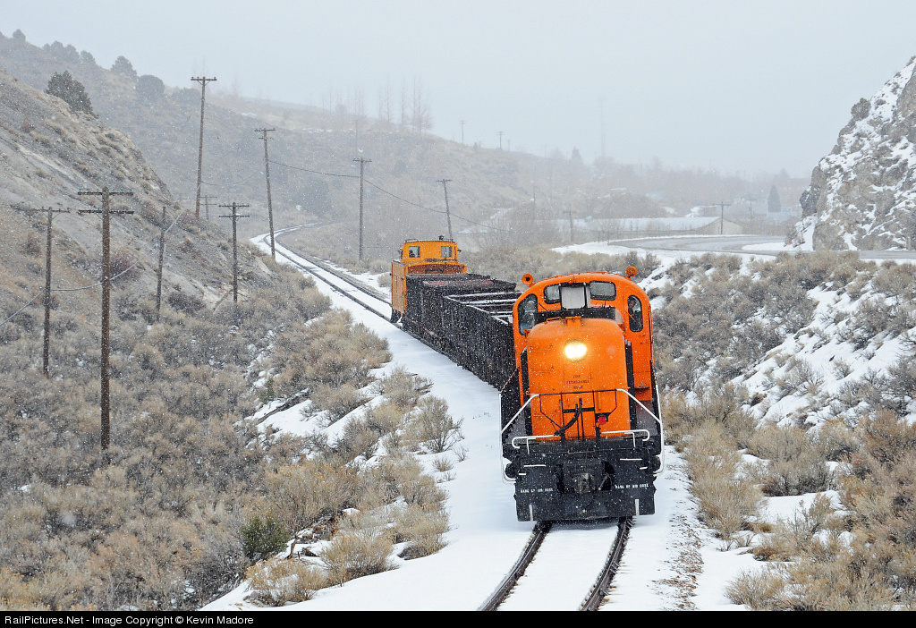 | A Nevada Northern ore train approaches the lower tunnel in Robinson Canyon during a snow shower. While most of the Nevada Northern Railway runs through a wide, flat valley, this 9-mile stretch running south from Ely to the Mines District is very different. It winds and twists through canyons and tunnels while featuring a pretty steady climb in altitude. The abrupt change in terrain often brings abrupt changes in the weather conditions. It is not uncommon to find partly cloudy skies in Ely, when just a few miles to the west there are low clouds and snow. This branch of the line parallels US Highway 50 - The Loneliest Highway in America. The roadway....which features some sharp curves of its own......is visible on the right side of the photograph. |