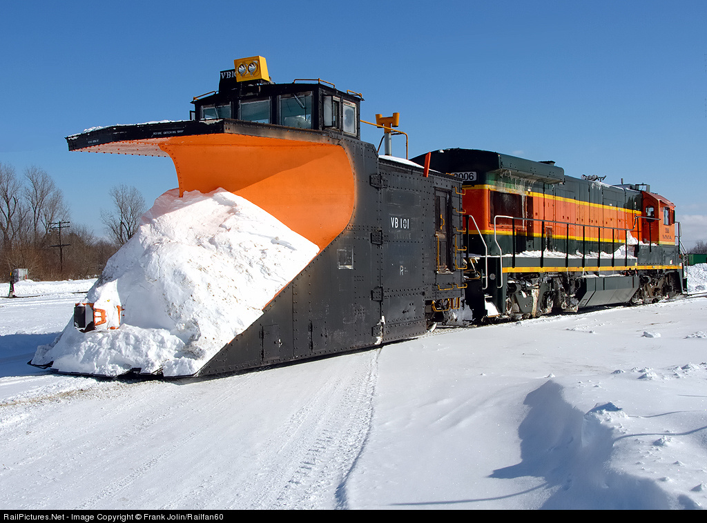 | VB 101 came from Sherbrooke through the storm last night. Soon it will be set off on the shop track and unit 2006 will pick up another plow then proceed north with another assignment |