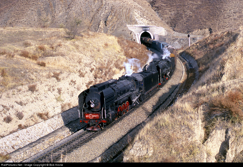 QJ 6577 and 6763 emerge from tunnel 1 running downgrade. The train is about to pass over the well-known Simingyi viaduct.