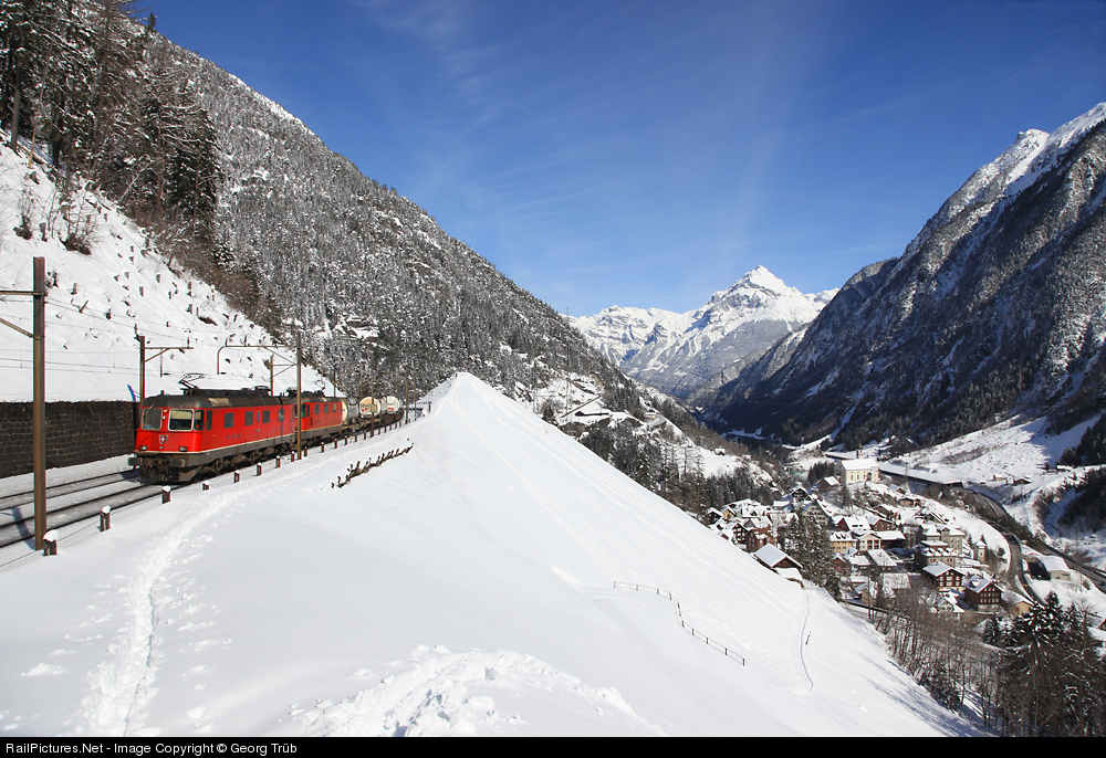 Re 6/6 and Re 4/4 II, standard traction for freights of SBB Cargo on the Gotthard line, with a train of HUPAC on the upper level. On the right the village of Wassen with the tracks of the middle level in front, in the background Chli Windgällen mountain.