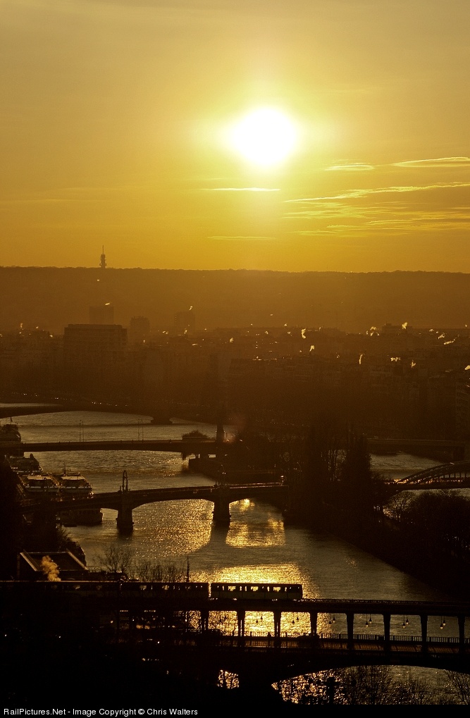 An MF67 set rolls across Bir Haikem viaduct with a late afternoon, La Defense-bound Metro Line 6 service, as seen from the second level of the Eifel Tower, Paris.