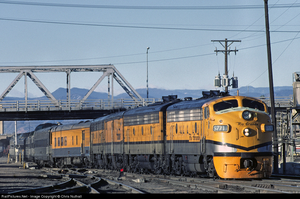On the start of its journey to Salt Lake City, #17 Rio Grande Zephyr snakes across the switches at Denver Union Terminal behind 5771 5762 253 and 5763 in March 1982.