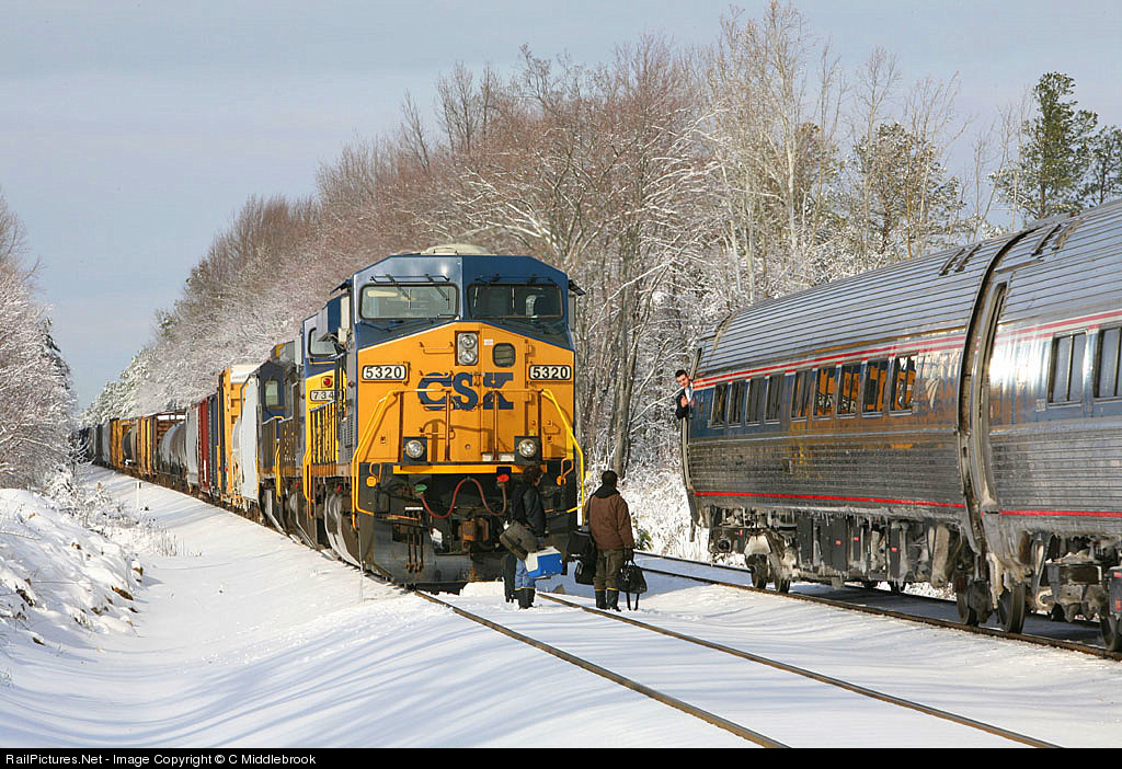 Amtrak Train #89 stops to pick up a CSX crew whose time has expired. The heavy snowfall and freezing temperatures caused many switches to freeze over and southbound trains were backed up on the #3 track causing several crews to run out of on-duty time. Train 89 picked up crews from multiple freight trains and transported them to the Richmond Acca Yard terminal.