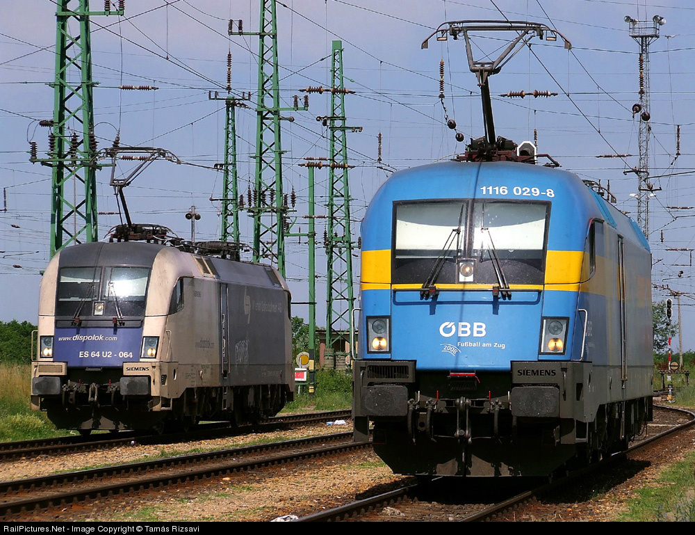 | The two engines (1116 029-8 + 182 064) are waiting at Hegyeshalom exit towards Austria. "Swedish" engine is moved on his train and after the break test it's going to Austria and Germany in Ingolstadt with AUDI company's train. The other engine (Wiener lokalbahnen, Dispolok company's engine) is waiting for the train, which arrives from Budapest with two hours of delay.Chance moment, that both engines are waiting for the clear signal...