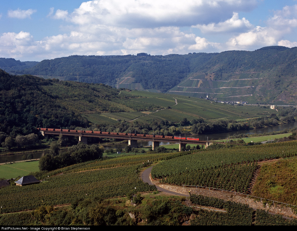 | A pair of DB Co-Co electrics cross the River Mosel from the Petersburg tunnel to Ediger-Eller station with a heavy northbound haul of six-axle hoppers. The vinyards on the slopes beyond the bridge are the steepest in Europe. |