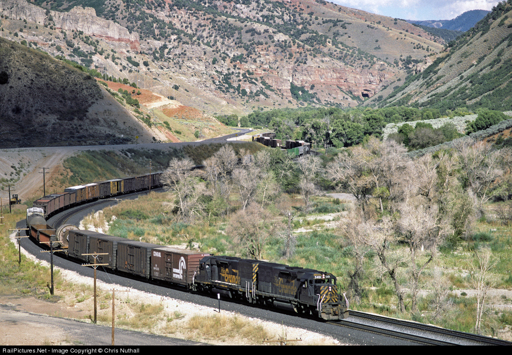 The dead trees testament to the extent of "Lake Thistle" from a couple of years previously, a westbound freight snakes its way down Spanish Fork Canyon behind 5401 and 5355 as it heads on the new alignment towards Thistle in August 1985. Barely visible up the valley are helpers 5398 and 5348 tacked on the rear end.