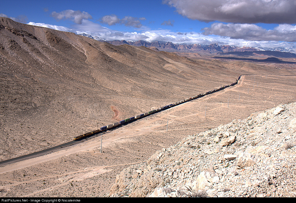 | This is a westbound stacktrain, heading for the port of Los Angeles, California. My vantage point is about 500 feet above the railhead. |