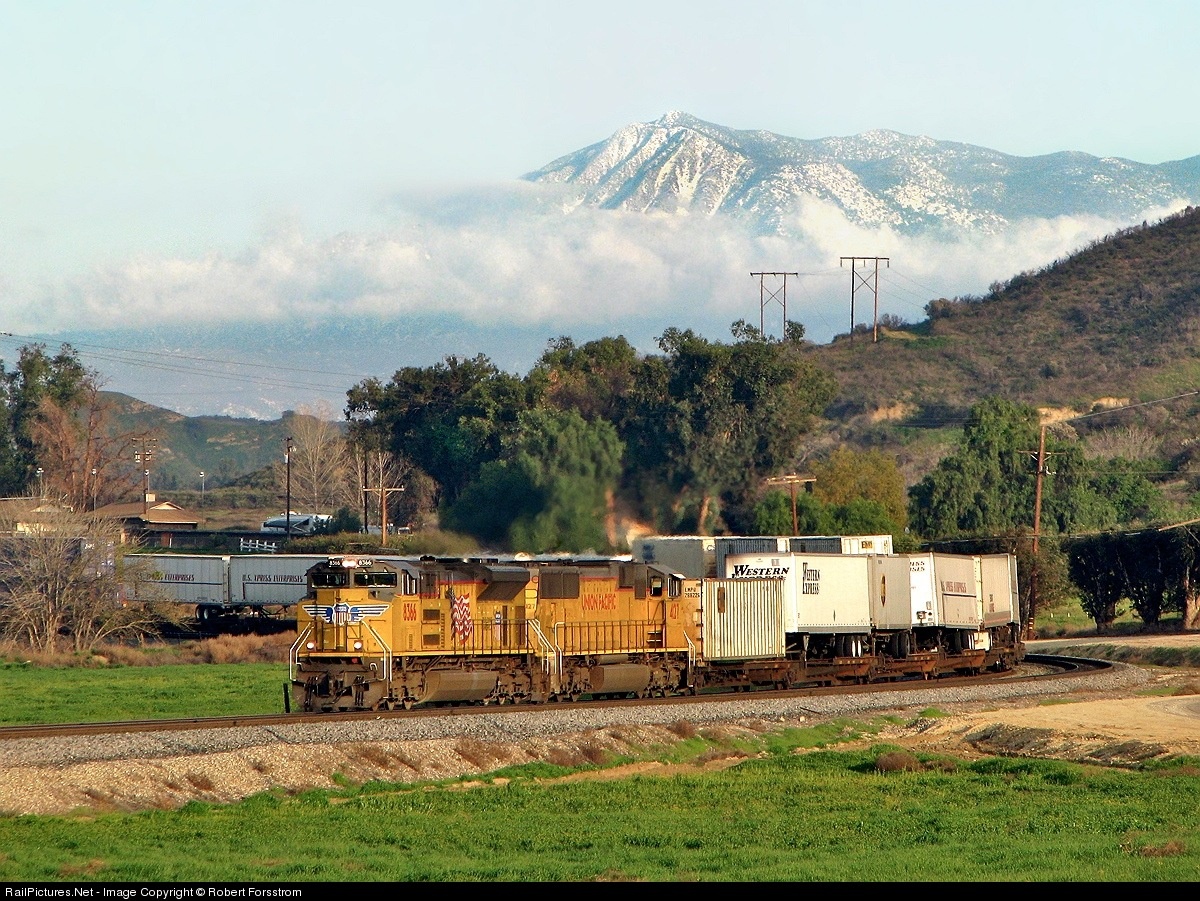 A westbound Union Pacific hotshot piggyback winding through San Timoteo Canyon, CA with snow covered Mt. San Jacinto in the distance.