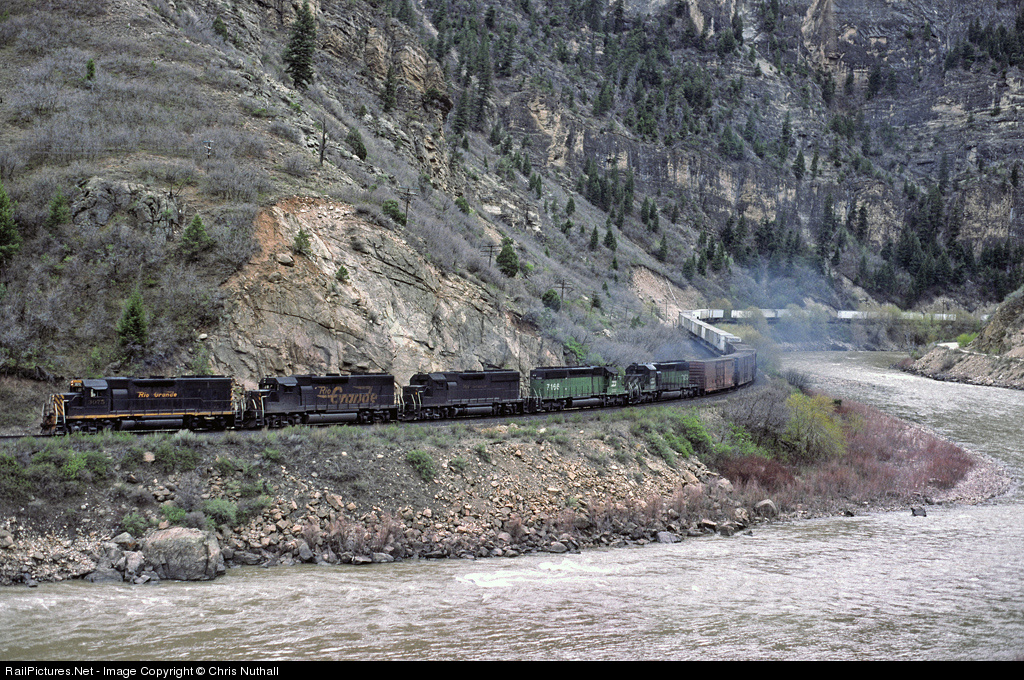 In a line up not ever dreamt of during my stay in Colorado six years earlier, DRGW 3075 3116 and 3057 combine with BN 7166 and 7150 on an eastbound freight at No Name, deep inside Glenwood Canyon near Glenwood Springs, on an overcast afternoon in April 1988