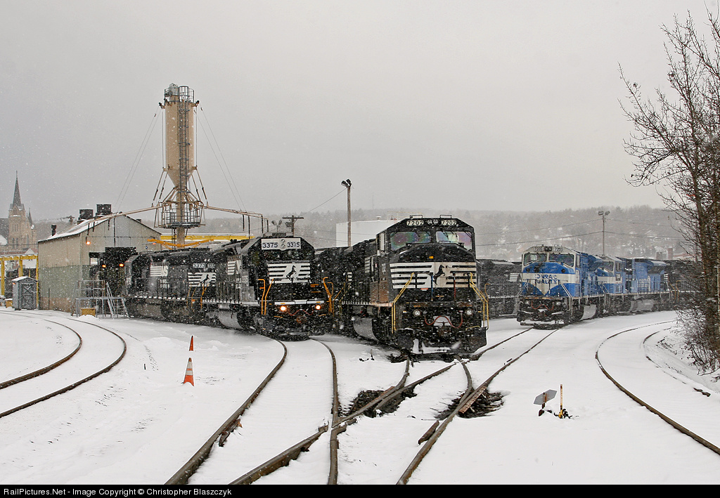 A quick snow shower darkened the skies over Cresson on this cold Saturday afternoon, which found a typical West Slope helper set, SD40-2s 3375 and 3373, sharing company with most of Norfolk Southern's SD80MAC fleet, including the last two in Conrail paint, at right. As of March 2009, the 7208 had already been repainted and 7205 is currently in the paint shop.