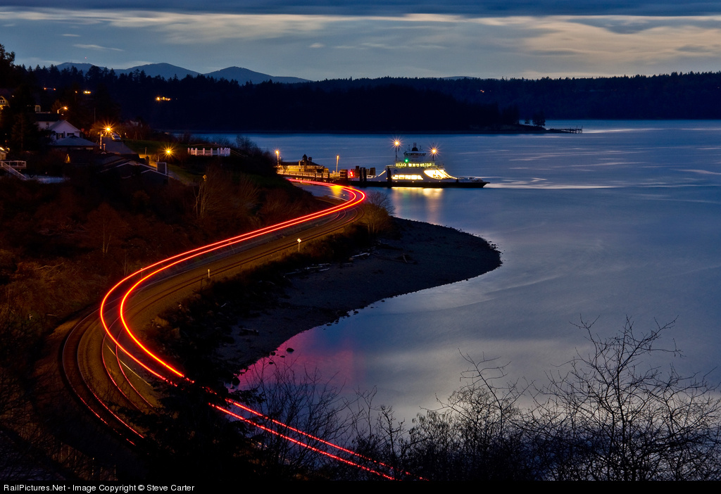 The Christine Anderson momentarily halts boarding as #509 streaks through the S curves, along the shores of Washington State's first incorporated city, Steilacoom. The original NP Point Defiance line was built with the provision, backed up by a city ordinance (#85) that NP "erect and maintain a good and substantial station, to cost not less than $3,000 and be constructed of either concrete, brick or cement plaster." NP was also required to stop daily, "not less than two northbound and two southbound passenger trains .." The little station on the other side of the hill hasn't seen a regular passenger train stop since the 1930s.