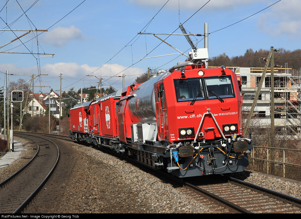 | Brand new fire extinguish and rescue train "LRZ 08" of Winterthur on a driver training run from Frauenfeld to Winterthur is passing Wiesendangen. The first car of the self propelled train (two 390 kW diesels, 100 k.p.h.) is a tank car with a water capacity of 52000 litre (13728 gallon). |