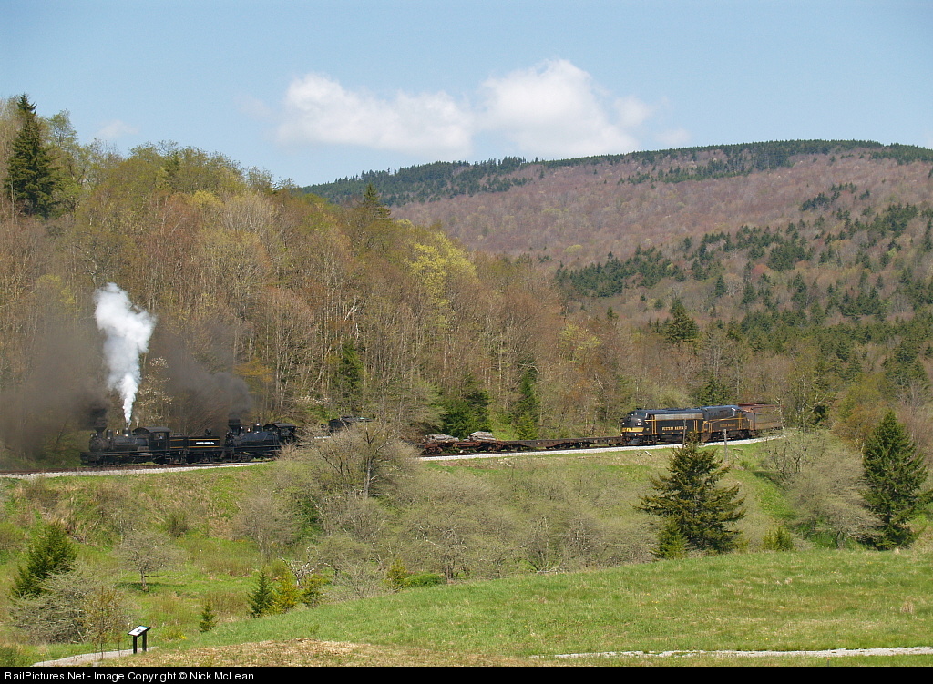 A double headed log train runs side by side with a pair of classic WM EMDs around the horseshoe curve that once circled the logging town of Spruce. Similar scenes will be recreated this May...check out www.msrlha.org.