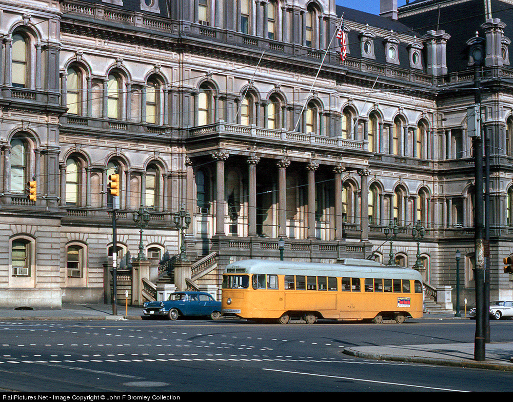 | The imposing Baltimore City Hall provided a splendid backdrop for passing PCC cars. Here Route 8 car is destined for Catonsville MD. Streetcar service ended November 3, 1963. Joe Jessel Jr Kodachrome. |