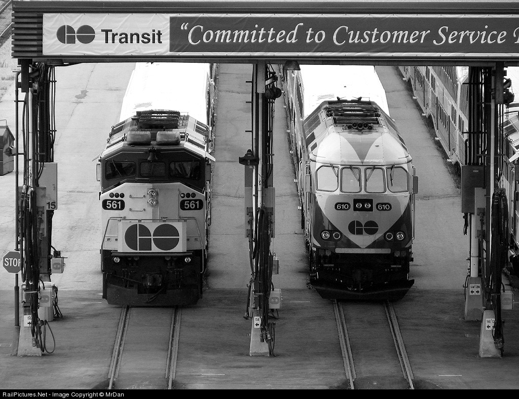 | Generations clash as one of the previous kings of GO's commuter trains waits beside one of the newcomers under the canopy at Willowbrook. Not long after, 561's future would take a turn for the worst as she suffered a turbo failure, sidelining her career. 610 is now in regular GO service. |