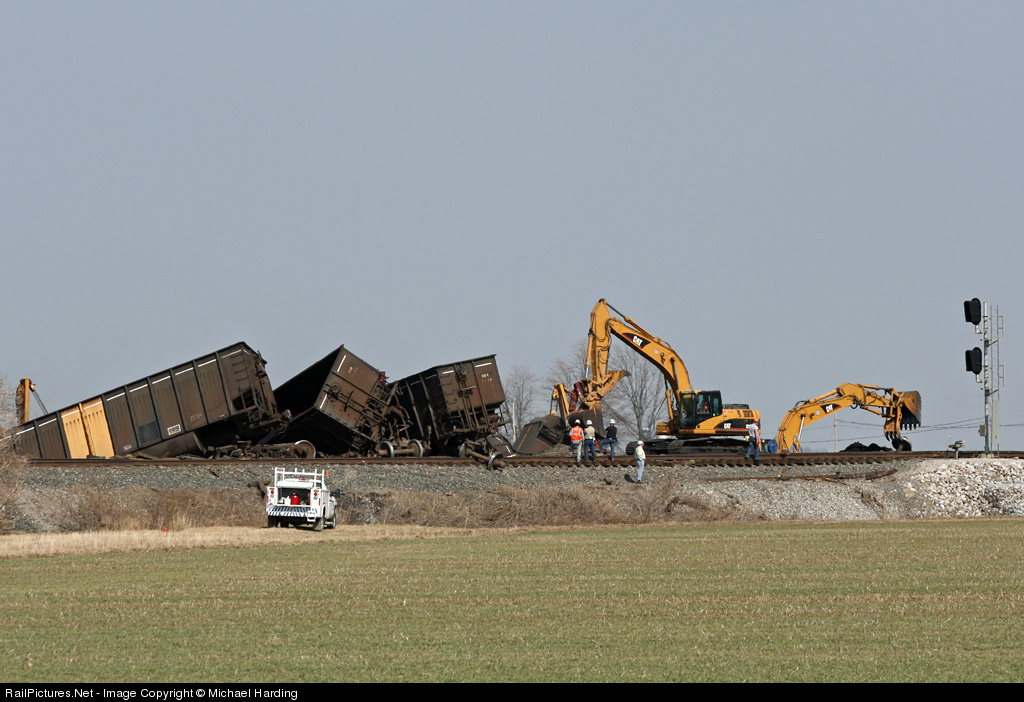 | According to internet reports, CSX Q114 saw sparks flying from a car on loaded coal train CSX T909 and notified them. T909 was running Westbound coming into Hamler, OH and trying to bring the train to a stop when the middle of the train derailed resulting in a reported 21 car pile-up on the CSX Chicago Mainline. This scene is at least 8-10 hrs after cleanup began and work is well under way to getting the line back open. To the right, you can see one piece of equipment dropping a wheel into a pile on the far side of the ROW while another is nudging a hopper car. Several other cars are still piled to the left. The signal on the North side of the tracks was taken out by the accident and the one on the South side still stands on the right side of the picture. |