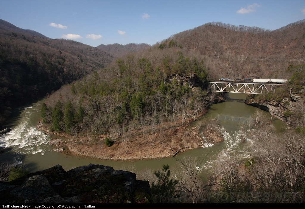 | This wide angle view shows us a different perspective of the famous bridge at Pool Point. On a journey that requires a a semi-lengthy journey off of the beaten path, I was rewarded nicely with great weather and a handful of trains to photograph. One can let the idle time roll by by watching the water flow down the Russell Fork of the Big Sandy River. This would be a good spot to watch kayakers in October. |