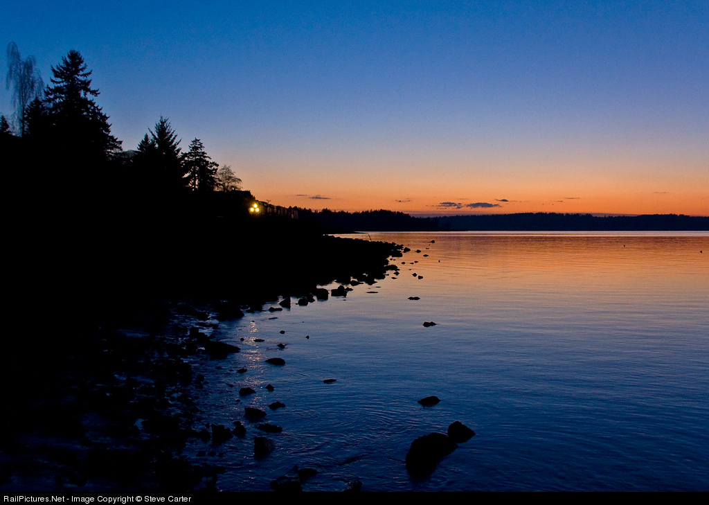 A quickly fading sunset along the Puget Sound, provides a dramatic setting for a UP freight trying to make it to Fife, WA before the crews hours are up. Hidden in the darkness is BNSF's bridge 15, over which the train is crossing.