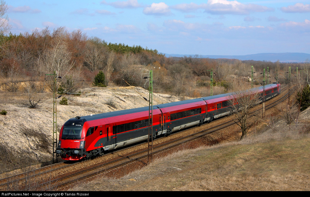 | Railjet train is passing near Szár village and heading to Hegyeshalom and München. Train is coming from Budapest Keleti station. |