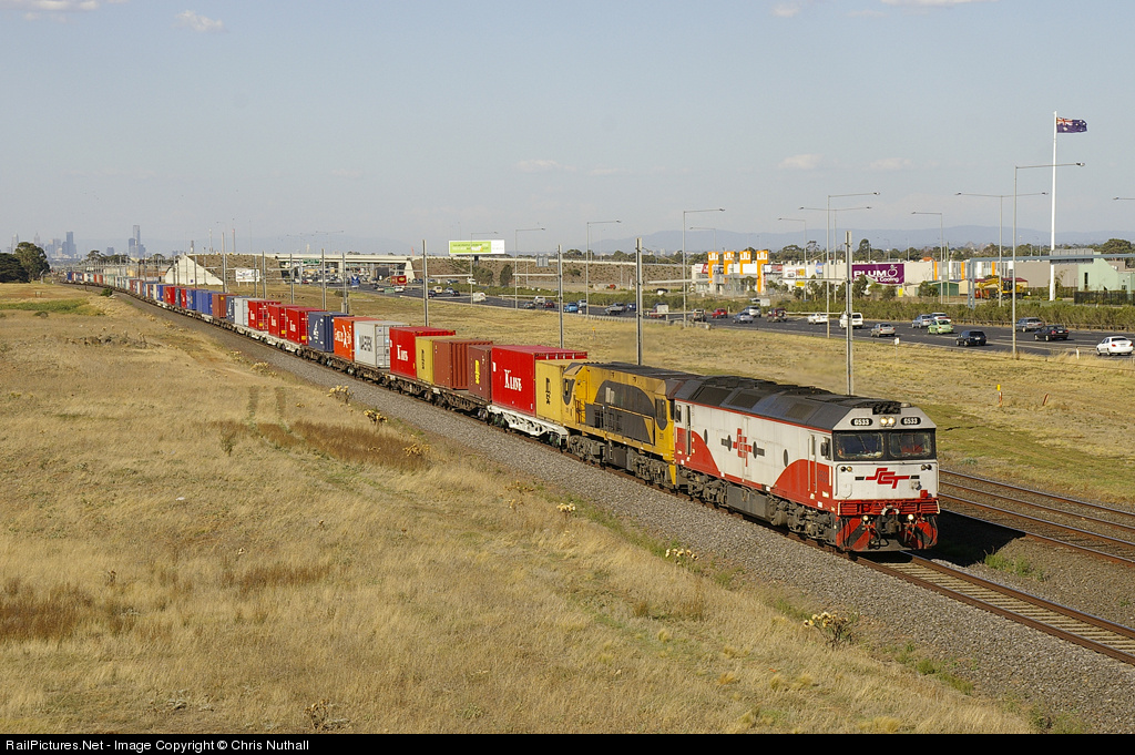 | With the Melbourne CBD to the left background, the Dandenong Ranges in the middle and a very tall flagpole to the right, hired SCT G class G533 and former Queensland Rail narrow gauge 2819 leave the city behind them as they head QRN's 7MA6 freight through Hoppers Crossing towards Adelaide on a sunny Saturday afternoon. |