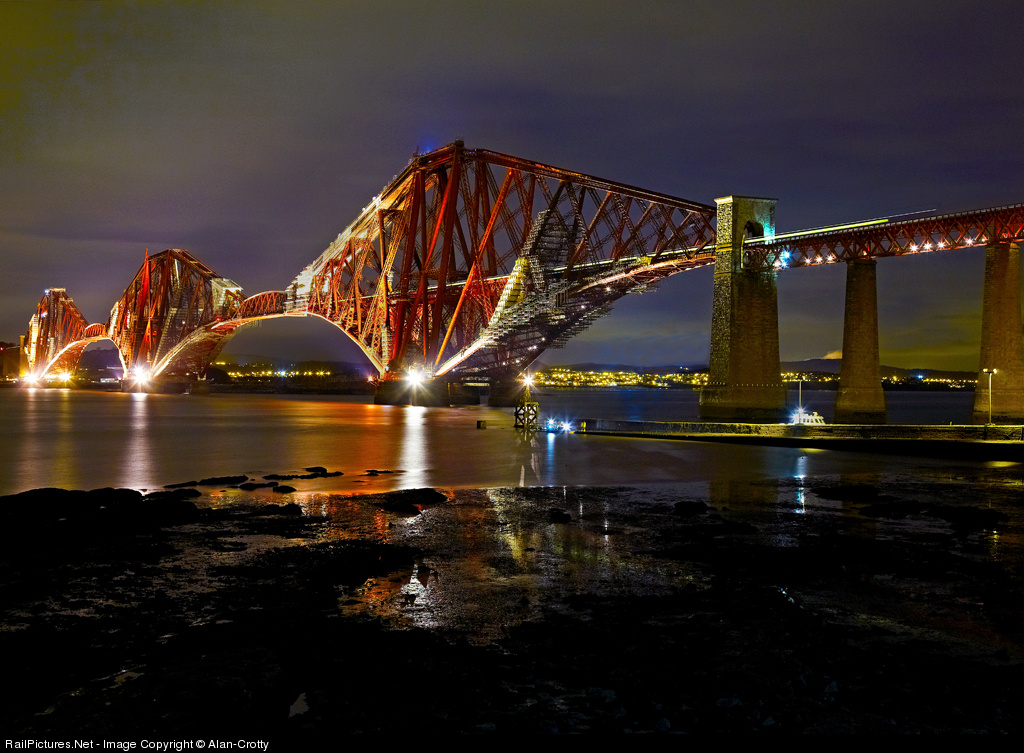 | A multiplicity of colour temperatures greet the class 67 hauled 2G13 17:08 Edinburgh to Edinburgh as it heads South across the famous Firth of Forth railway bridge. The train is due at Dalmeny 1854 so is running just a couple of minutes late. A 20second exposure at f8 400ISO has captured the headlamp and coach light streaking across the last cantilever section of the bridge. |