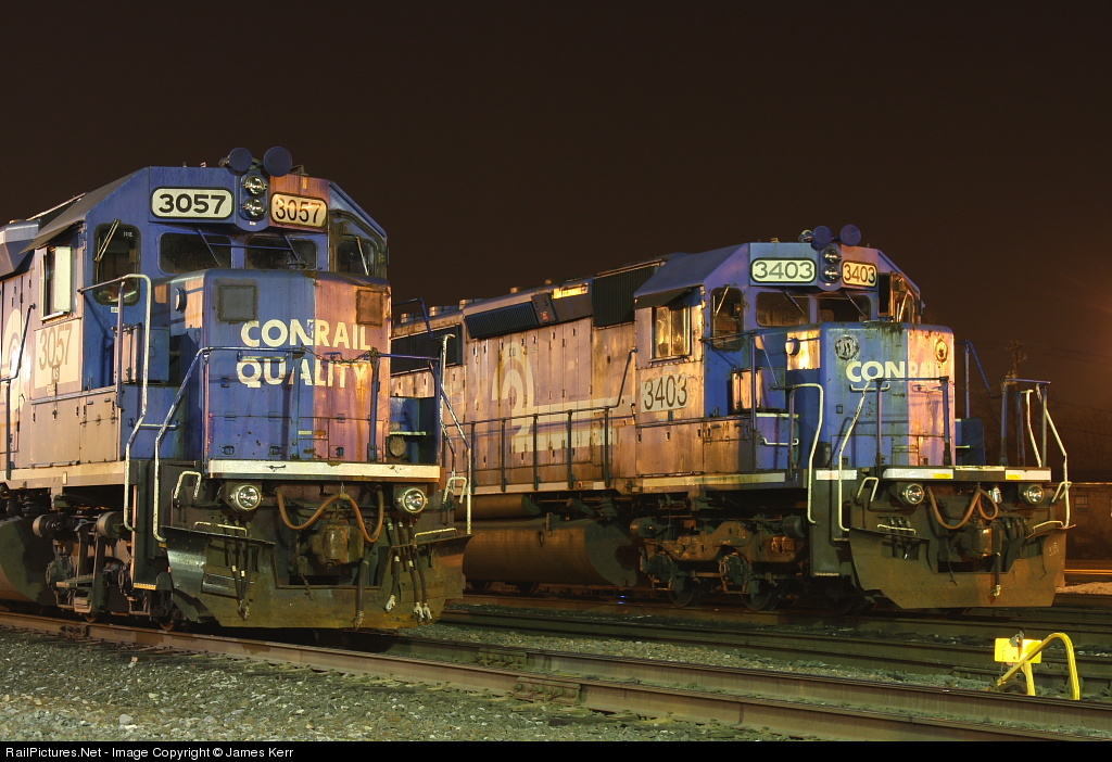 Conrail painted pair of units GP40-2 3057, and SD40-2 3403 await the next shifts crews at the intermodal yard in Harrisburg, PA.