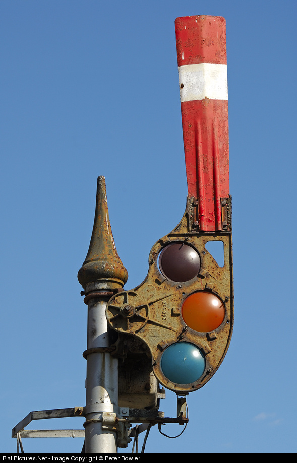 The famous Crawfordsville "Shorty" semaphore in living color, up close. The so-called "shorty" name derives from the northbound blade being mounted several feet lower than the SB blade of this pair, one of the few left on the line.