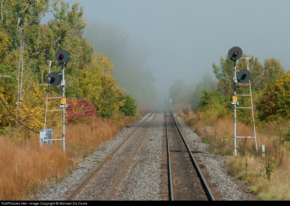Heading eastbound along the south track of the Oakville Subdivision, we are about to knock down the advance signal to Port Credit, the hotbox detector is 0.6 miles away and what you see in front of you isn't smoke but lake effect fog rolling in off Lake Ontario, neat eh ?