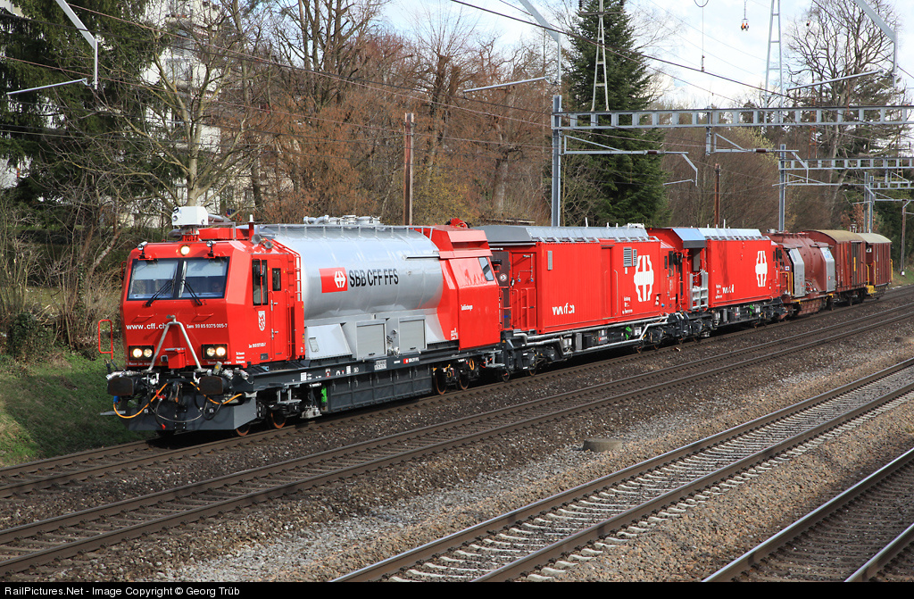 | The new selfpropelled fire fighting and rescue train "LRZ 08" of Winterthur is returning from a driver training run to Frauenfeld, towing the old not selfpropelled "LRZ 76", which will be withdrawn from service when the staff is fully educated on the new one. The LRZ 08 has a power output of 1560 kW and can pull a train of 730 tons on a grade of 2.6 %. |
