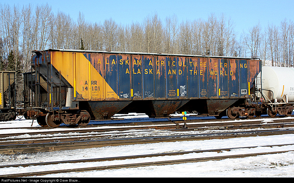"Alaskan Agriculture" - Now how is that for an oxymoron? This hopper is one of two that wear this unique paint scheme. A small fleet was purchased in the early 1980s to support export from the state's Delta Barley project. That agricultural initiative turned out to be a failure and the railcars were sold except for two which the ARR purchased. These cars now travel to and from Washington state by barge where they are used to ship feed and fertilizer to AK Mill and Feed in Anchorage.