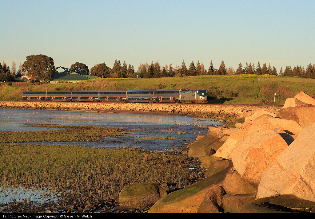 Amtrak 547 rolls along the edge of the San Francisco Bay, as the passengers enjoy a beautiful sunset over the water.