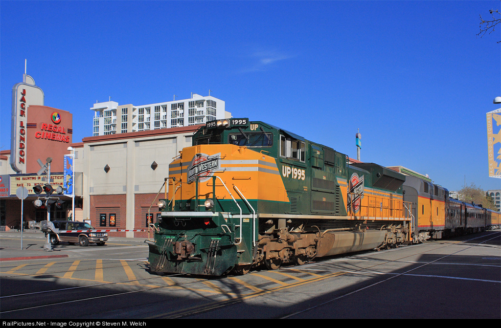 | UP1995 makes its first appearance into the Bay Area leading an inspection special. It's just moments from pulling into the Oakland Yard, as it rolls up the famed Jack London Square |