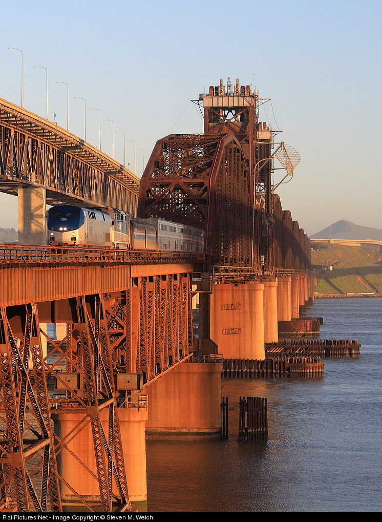 | Amtrak 11, the Coast Starlight from Seattle crosses the Benicia Bridge high above the Suisun Bay on a beautiful Spring morning. |