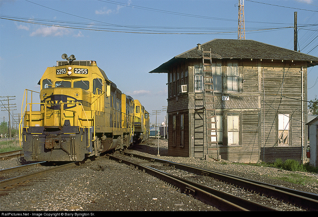 | In it's dying days, Tower 17 was still an interesting place to be at times, even if it was uninteresting power. Here one of the Santa Fe's gawdawful GP9 rebuilds heads up the local headed up to Chips to switch out some grain cars. It is crossing the SP Sunset route. |