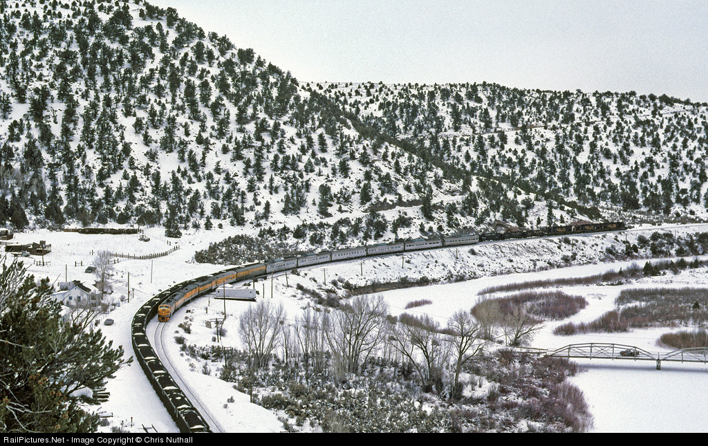 On a bitterly cold and overcast day, when sky, snow and river merged into one, an eastbound coal behind 5396 5393 and 5383 finds itself in the hole at Radium, west of Kremmling, for a meet with the westbound Rio Grande Zephyr, in January 1982