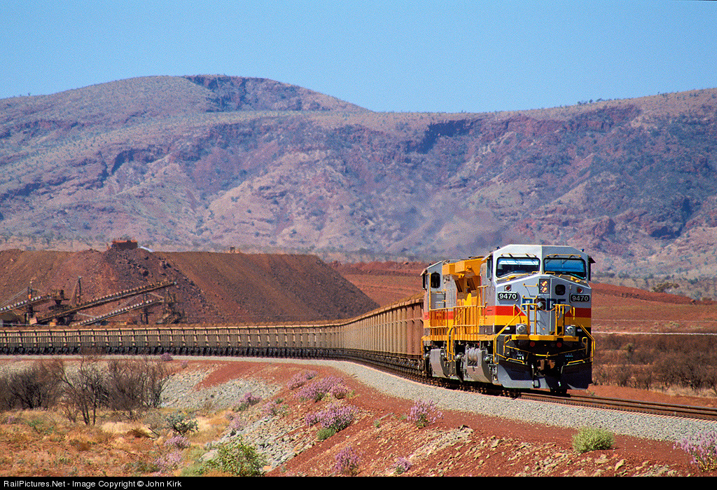 Newly introduced Pilbara Rail locos 9470/9472 nicknamed 'Yellowtails' at the head of a set of 'Robe' ore cars beneath a spectacular landscape at the newly opened West Angelas iron ore mine.