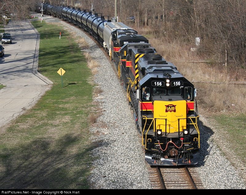 | Iowa Interstate ran an extra ethanol train from Blue Island to Rock Island today as it heads west through Morris. Iowa SD38-2 156 is in charge, followed by a GP38-2 and a GEVO. |