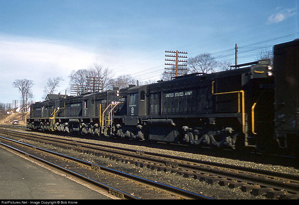 | U.S. Army Alco MRS-1 units B-2047, B-2056 & B-2052 pull a westbound West Shore freight. These low profile units were seen for a short time on this division of the New York Central. |
